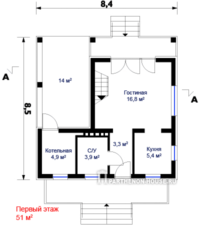 Габаритные размеры дома: 8,5 х 8,4 х 8,50 м.