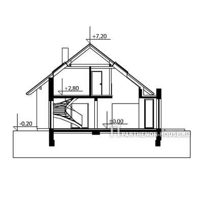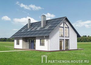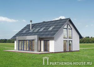 Проект современного дома с мансардным этажом. Много света, большие пространства, жилая комната на первом этаже, четкое разделение на жилую и техническую зону. Можно долго перечислять все достоинства этого замечательного дома для комфортной жизни за городом.