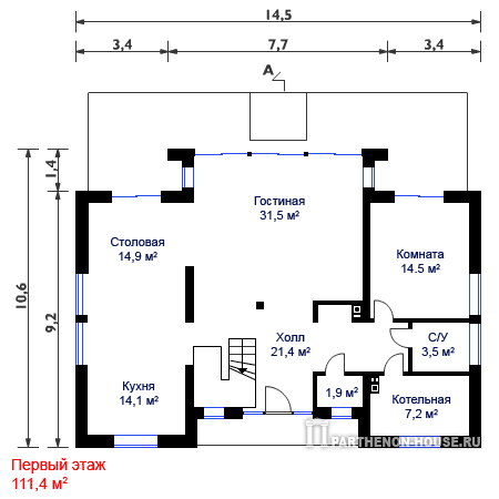 Габаритные размеры дома: 14,5 х 10,6 м.
